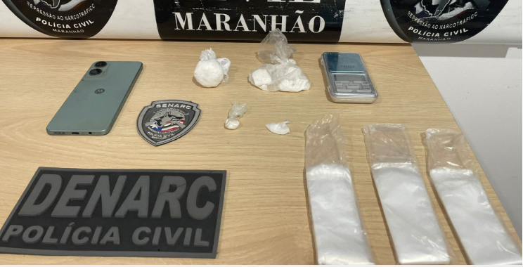 Anteriormente e foi indiciado pelo crime de tráfico de drogas, e desde o ano passado já estamos investigando ele. Hoje chegou uma denúncia falando de ponto de venda de drogas, então a equipe se deslocou ao local, no bairro Bela Vista, e logramos êxito em abordá-los, ele e sua companheira. Na casa, encontramos indícios de entorpecentes no imóvel e localizamos, em uma vasilha, balança, cocaína e vários sacos plásticos", disse o chefe de investigação do Denarc Maranhão-Timon, Edilberto.