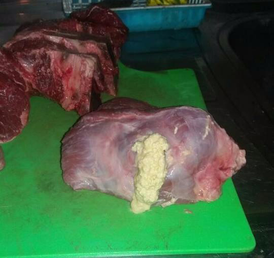 Na postagem, ele relata que o produto veio "com excesso de pus dentro de um tumor" e que, ao procurar o supermercado, "falaram que seria por causa da vacina dada ao gado", provavelmente contra a febre aftosa (foto abaixo; imagem forte).