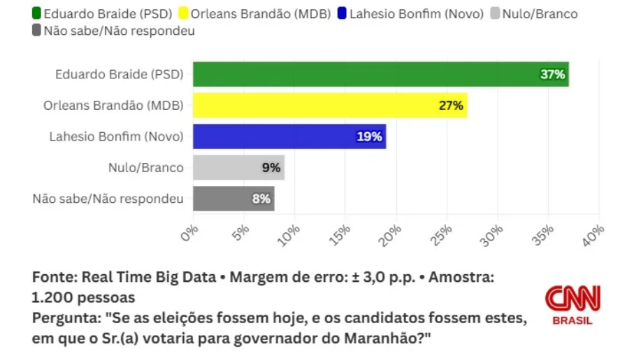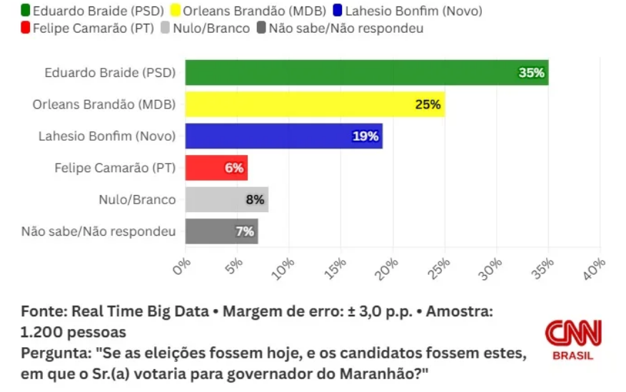 No primeiro cenário testado pelo levantamento, Eduardo Braide tem 35% das intenções de voto, contra 25% de Orleans Brandão (MDB), secretário estadual de Assuntos Municipalistas. Na sequência, aparece Lahesio Bonfim (Novo), ex-prefeito de São Pedro dos Crentes, com 19%.