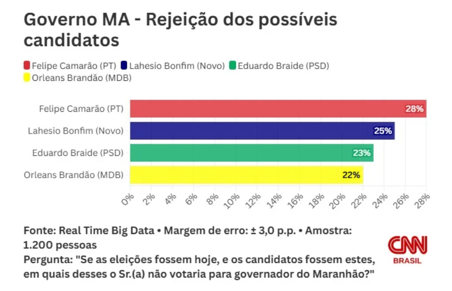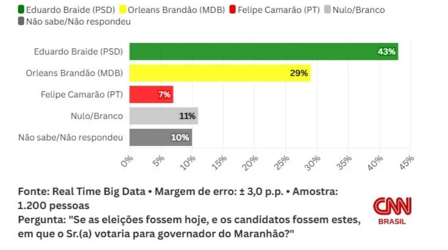 Já o vice-governador do Maranhão, Felipe Camarão (PT), assinala 6%. Votos em branco e nulo somam 8%. Outros 7% não souberam ou não responderam.