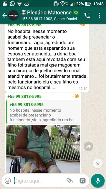"Aqui no hospital, acabei de presenciar o funcionário , vigia, agredindo um homem que está esperando sua esposa ser atendida" disse o morador revoltado com a situação.