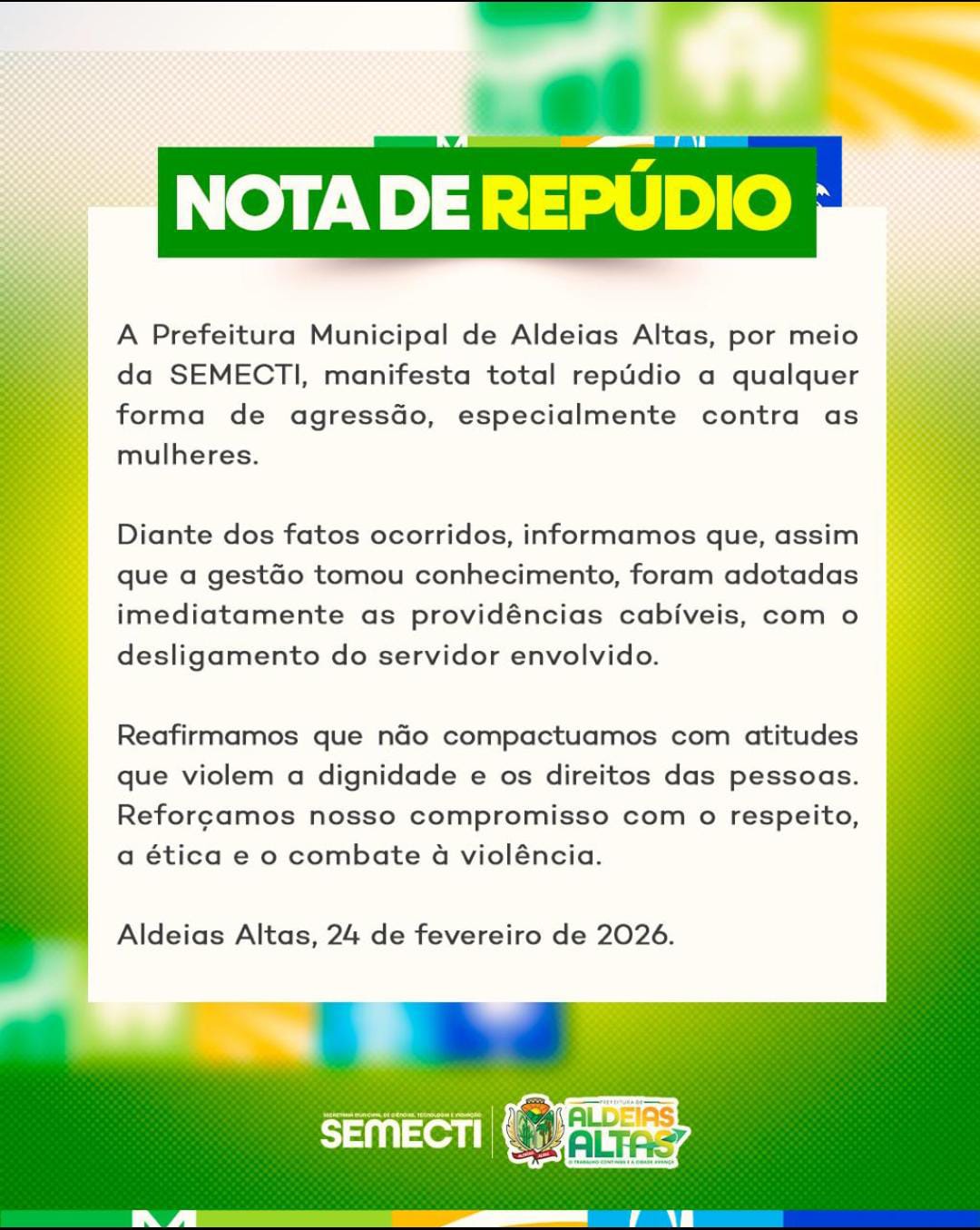 A Prefeitura de Aldeias Altas, através da Secretária da Mulher divulgou uma nota, repudiando o caso, no qual foi vitima uma mulher