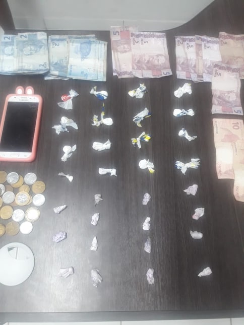 Segundo informações, ao perceber a chegada da polícia a traficante arremessou um saco plastico com trouxinhas de drogas e crack e uma quantia em dinheiro obtido na venda de drogas