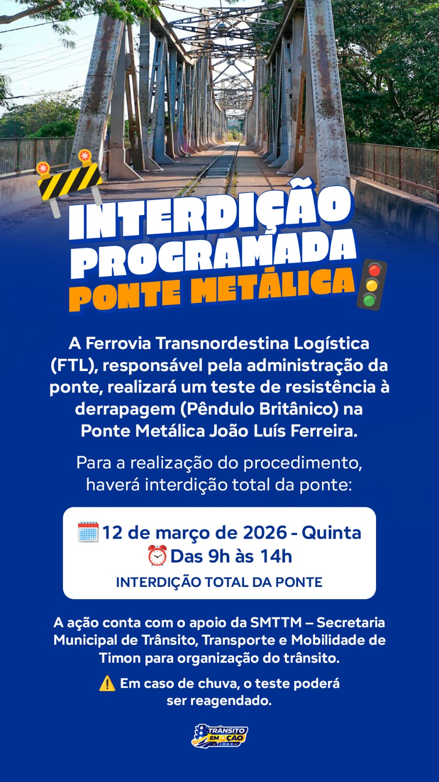 A concessionária responsável pela administração da ponte, FTL – Ferrovia Transnordestina Logística, realizará nessa quinta-feira(12),um teste de resistência à derrapagem (Pêndulo Britânico) na Ponte Metálica João Luís Ferreira, para procedimento técnico necessário para avaliação das condições de segurança da via.