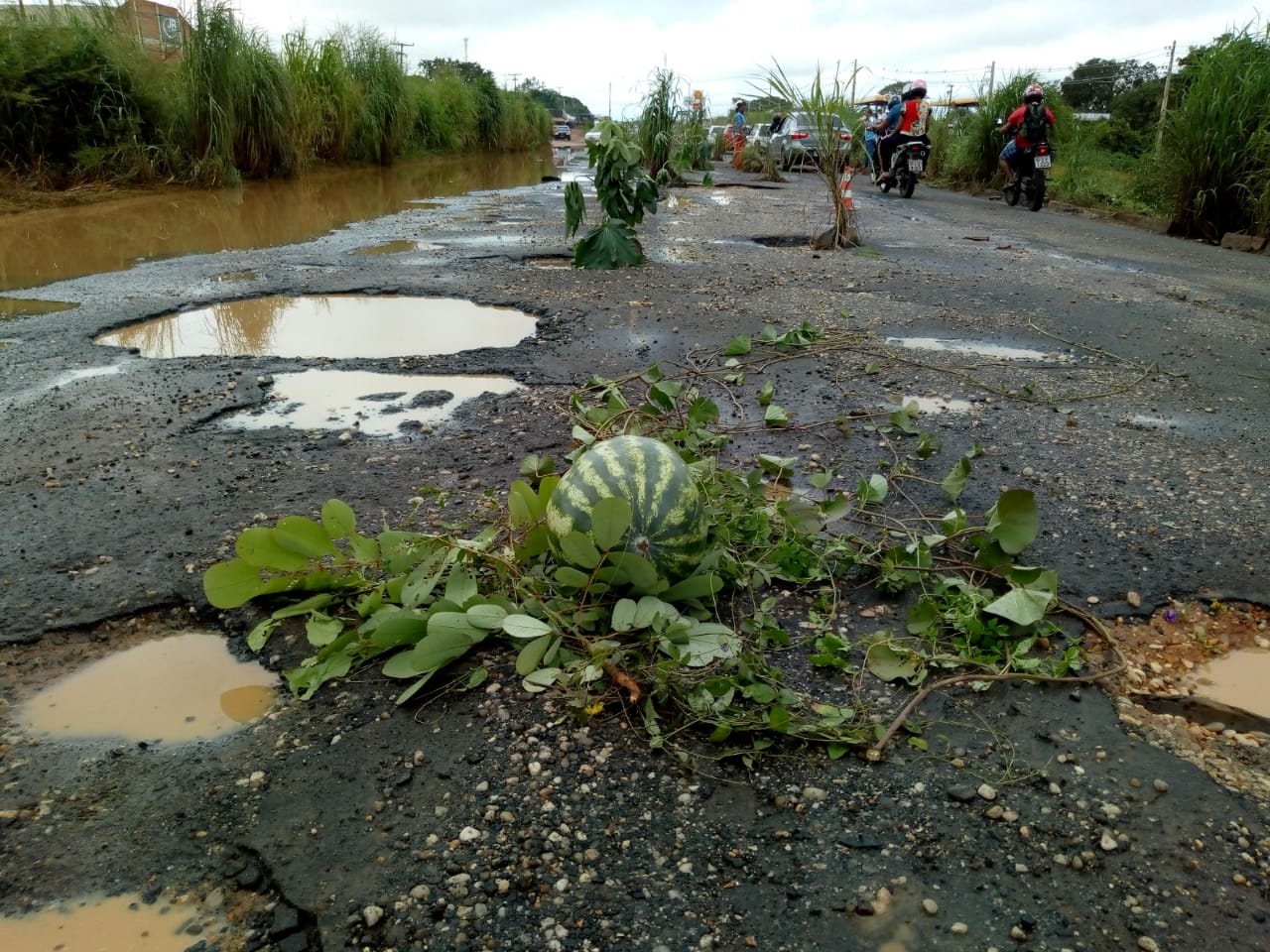 Protesto:Em Teresina,populares plantam melancia e cana de açúcar nos buracos da BR-316
