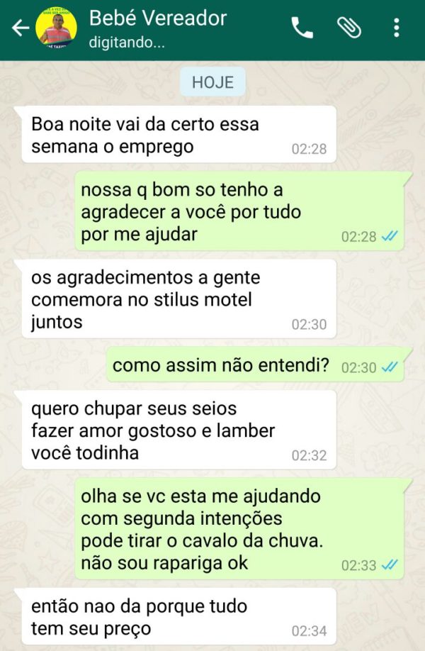 Na conversa, o vereador diz que o emprego prometido daria certo, mas que em troca iria levar a mulher para agradecê-lo em um motel de Imperatriz