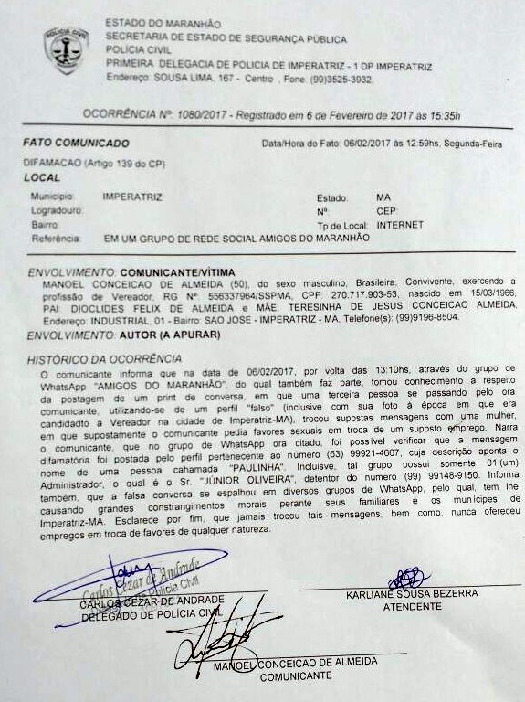 Bebe Taxista afirma que jamais ofereceu empregos em troca de favores de qualquer natureza e, ainda, que a mensagem difamatória teria partido de uma pessoa identificada apenas como Paulinha, que estava no grupo de WhatsApp chamado "Amigos do Maranhão".