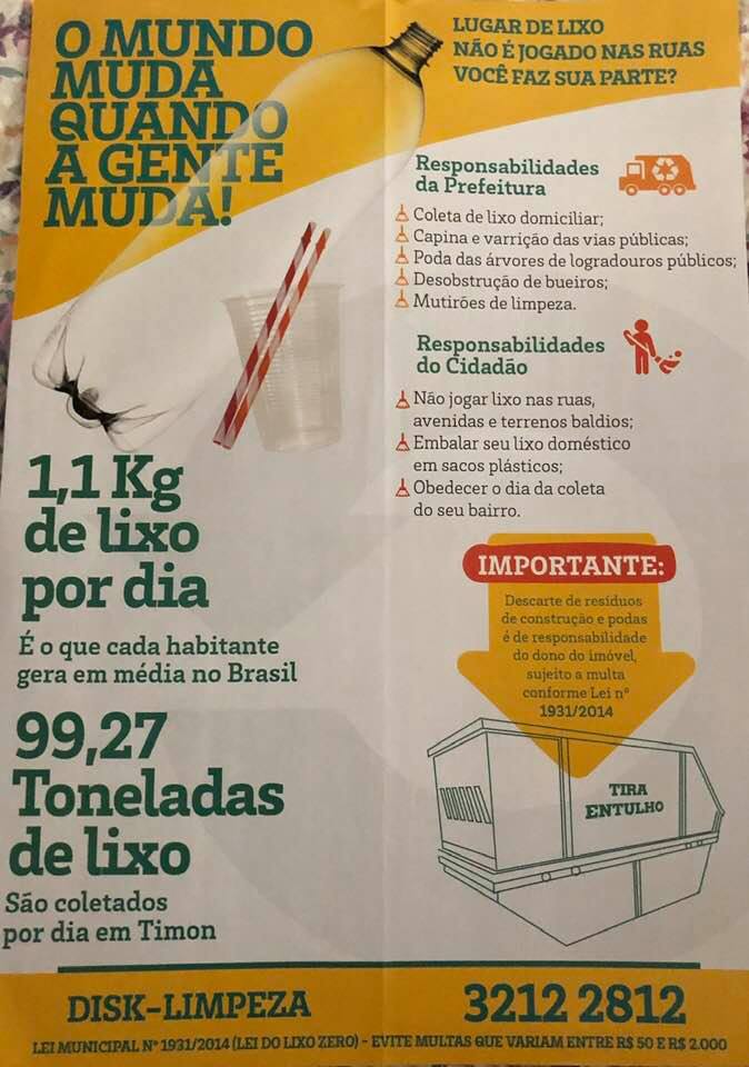 Durante a conversa com cada feirante, além da conscientização foram entregues panfletos com muitas informações sobre a importância do descarte do lixo de forma correta, dias de coletas do lixo domésticos nos bairros e Avenidas, além de outras informações