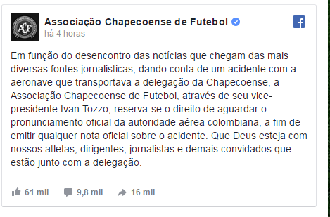 A Confederação Sul-americana de Futebol, por meio de nota, confirmou que foi notificada por autoridades colombianas sobre o acidente envolvendo a aeronave que transportava a equipe da Chapecoense. No comunicado, a Conmebol lamenta o ocorrido