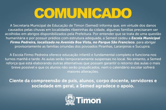 De acordo com uma nota que está sendo divulgada nas rede sociais, a Escola Firmo Pedreira, que fica localizada na Avenida Boa Vista, bairro Parque São Francisco, será colocado a disposição para alojar as famílias desabrigadas que foram atingidas pela chuvas que caíram com intensidade na região Ribeirinha, em Timon.